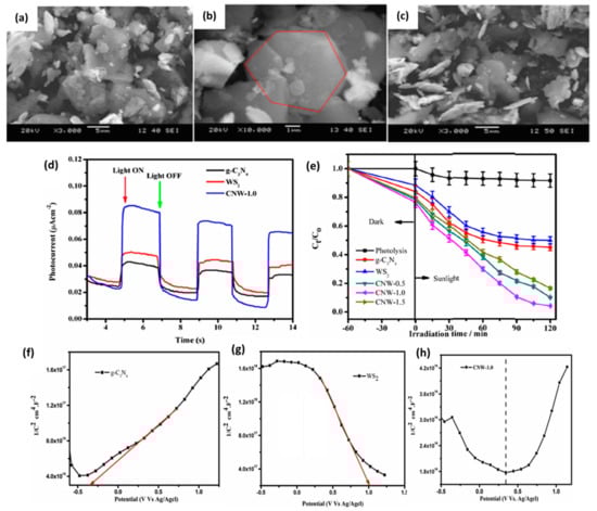 Similarly, Nawaz, Goudarzi, Sarvanan, and Zarrin reported the preparation of z-scheme of g-C3N4/WS2 via one-pot hydrothermal synthesis without using a reducing agent. They attempted to synthesize different heterojunctions by changing the concentration of WS2 and keeping g-C3N4 to be as follows: CNW-0.5, CNW-1.0, and CNW-1.5, and they were characterized via several techniques including SEM as shown in Figure 15a–c. The study showed that the CNW-1.0 sample has improved charge mobility, and its transient photocurrent exhibited a prolonged lifetime of the charge carriers, using the Nyquist Plot. Moreover, Mott Schottky (MS) plots in Figure 15f–h showed the p-n junction formation of the heterostructure with a potential energy barrier at the junction. The average lifetime demonstrated by the time-resolved transient PL decay curves was 2.6 times higher for CNW-1.0 compared to WS2 alone. In addition, the same composite achieved 95.5% photocatalytic degradation for MB as the best composite among all samples as shown in Figure 14e, having (O2•−) and (•OH) as the dominant radicals. The CNW-1.0 had the highest photocurrent, which was 1.8 and 2.05 times higher than that of WS2 and g-C3N4, respectively, as represented by the curve in Figure 15d. The researchers succeeded in providing a cost-effective photocatalyst using a Z-scheme mechanism with an improved photocatalytic activity for removing organic pollutants from water efficiently.