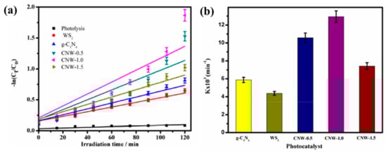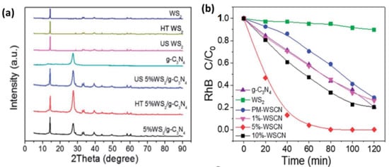 Another work was conducted by Zeng, Ji, Su, and Zhang who prepared a heterogeneous WS2/g-C3N4 composite photocatalyst using a facile ultrasound-assisted hydrothermal method varying in weight percentage of WS2 and used different techniques to characterize the composites such as XRD (Figure 16a). It was used to regenerate NAD+ to NADH photocatalytically, which was then used for the sustainable bioconversion of CO2 to methanol with the aid of visible light irradiation. The study found that the fabricated WS2/g-C3N4 composite with 5 wt% of WS2 achieved the highest activity for methanol production nearly 7.5 times higher than that produced by pure g-C3N4. The same composite also achieved about 100% of RhB removal ratio as a photocatalyst in 1 h, which is 2.6 times higher than that of g-C3N4 alone as can be seen in Figure 16b. According to this study, the enhancement achieved by the fabricated heterojunction was attributed to the formation of a heterojunction interface between WS2 and g-C3N4, which provides an enhancement of the photo-harvesting efficiency and decreases the recombination of electrons and holes.