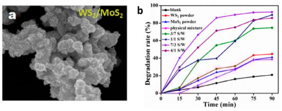 - Zhao, Y.; Liu, J.; Zhang, X.; Wang, C.; Zhao, X.; Li, J.; Jin, H. Convenient Synthesis of WS2-MoS2 Heterostructures with Enhanced Photocatalytic Performance. J. Phys. Chem. C 2019, 123, 27363–27368. [Google Scholar] [CrossRef]