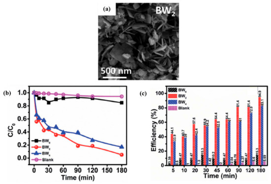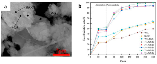 TEM image of WS2/BiOBr (a), degradation efficiency of different pollutants with WS2/BiOBr (b). Reproduced with permission [82]. Copyright 2020, Elsevier.