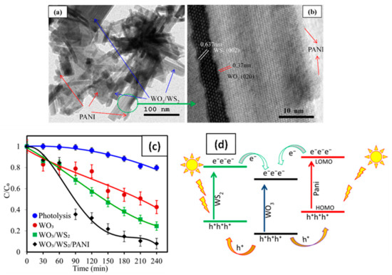 - Barakat, M.A.; Kumar, R.; Almeelbi, T.; Al-Mur, B.A.; Eniola, J.O. Sustainable visible light photocatalytic scavenging of the noxious organic pollutant using recyclable and reusable polyaniline coupled WO3/WS2 nanohybrid. J. Clean. Prod. 2022, 330, 129942. [Google Scholar] [CrossRef]