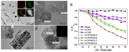 Another work was conducted by Qi and his team that aimed to prepare WS2/BiOCl heterojunction using an in situ preparation method by stacking 1–2 μm on a 2–5 μm layer of WS2 and used several analytical means such as XRD and EDS element mapping to reveal the crystallization of the prepared composite. The team synthesized the heterojunction with a varied mass ratio of WS2 ranging as follows: 1%, 3%, 5%, 7%, and 9%. The study found that by increasing the mass ratio of WS2, the visible light response range of BiOCl increases. The best degradation efficiency against MB was exhibited by 7%-WS2/BiOCl, which is shown in TEM and HRTEM images in Figure 12a–c. This heterostructure reached 95.83% in 240 min. The outstanding performance of 7%-WS2/BiOCl can be concluded from Figure 12d,e.