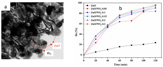 A novel heterostructured photocatalyst WS2/BiOBr was fabricated by Fu and his team, using the facile hydrothermal method. TEM technique was used to characterize the synthesized composite as shown in Figure 10a. The fabricated quantum dots showed excellent removal efficiency toward Rhodamine B reaching a 95% of removal rate, in addition to other water pollutants such as ciprofloxacin as represented by Figure 10b. This activity is attributed to the oxygen vacancies offered by this heterostructure, which contribute to harvesting the visible light as well as the separation of photo-induced electron-hole pairs. In addition, the synergistic effect between the fabricated photocatalyst and the oxygen vacancies was found to enhance the photocatalytic process. The researchers proposed the photocatalytic mechanism via the electron spin resonance and the trapping experiment (i.e., performed to study the roles of active species in the process of CIP degradation) and proved that holes, O2•− and •OH played an important role in the process.