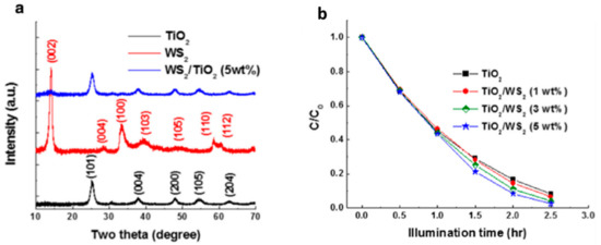 - Cho, E.C.; Chang-Jian, C.W.; Zheng, J.H.; Huang, J.H.; Lee, K.C.; Ho, B.C.; Hsiao, Y.S. Microwave-assisted synthesis of TiO2/WS2 heterojunctions with enhanced photocatalytic activity. J. Taiwan Inst. Chem. Eng. 2018, 91, 489–498. [Google Scholar] [CrossRef]