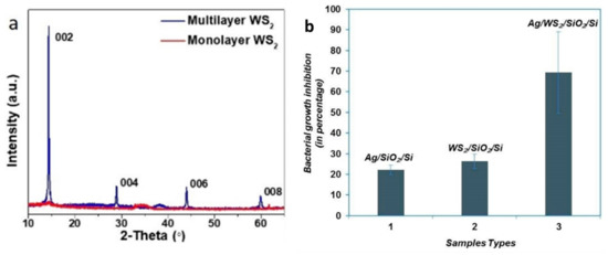 - Kumar, P.; Kataria, S.; Roy, S.; Jaiswal, A.; Balakrishnan, V. Photocatalytic Water Disinfection of CVD Grown WS2 Monolayer Decorated with Ag Nanoparticles. ChemistrySelect 2018, 3, 7648–7655. [Google Scholar] [CrossRef]