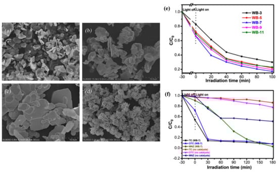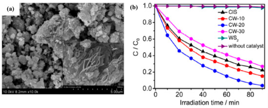 Tran, Truong, Nguyen, and others synthesized WS2/g-C3N4 composite photocatalysts varying in the amounts of WS2 and g-C3N4 using a facile calcination method that involved heating the mixtures of tungstic acid and thiourea considering that the relative content of WS2 in the composites decreases with increasing the amount of thiourea used in the mixture. The composites synthesized differed in the weight ratios of the precursors (tungstic acid and thiourea) as follows: 1:5, 1:7, and 1:10 to be denoted as nWCN, where n is equal to 5, 7, and 10, respectively. Figure 14a–e represents the SEM images of the synthesized WS2, g-C3N4, and the three composites. Generally, the fabricated composites showed enhanced photocatalytic activity in the degradation of methylene blue compared to the activity of each component separately. It was found that 7WCN exhibited the best photocatalytic activity among other heterostructures, which can be observed in Figure 14f of the photodegradation of MB using the fabricated composites. In addition, the authors observed a synergistic effect between WS2 and g-C3N4 in photocatalytic activity for the heterostructures synthesized.