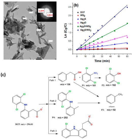 - Torad, E.; Mohamed, M.M.; Khalil, M.M.H.; Ismail, E.H. Optimal design of silver@silver sulfide-modified WS2 and its application in photocatalytic diclofenac degradation and H2 generation. J. Environ. Chem. Eng. 2021, 9, 106446. [Google Scholar] [CrossRef]