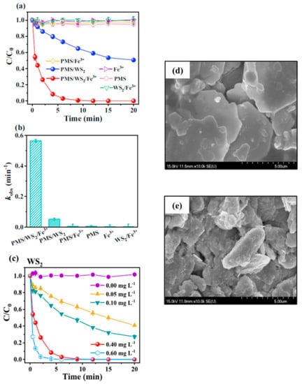 - Luo, H.; Liu, C.; Cheng, Y.; Zeng, Y.; He, D.; Pan, X. Fe(III) greatly promotes peroxymonosulfate activation by WS2 for efficient carbamazepine degradation and Escherichia coli disinfection. Sci. Total Environ. 2021, 787, 147724. [Google Scholar] [CrossRef]