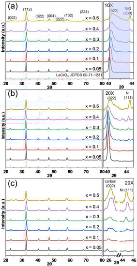 Different from the changing trend of the perovskite crystallite size determined by XRD, the BET-specific surface area of fresh LaNixCr1−xO3 samples is between 7–10 m2 g−1, and it did not show an increasing trend with the Ni content (see Table 2), indicating that the perovskite grains are polycrystalline, so the BET surface area did not change much. The relatively smaller BET-specific surface area is common for perovskite powders prepared by the sol–gel combustion method because the synthesis process temperature is high [].