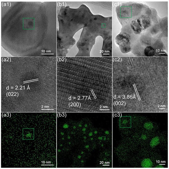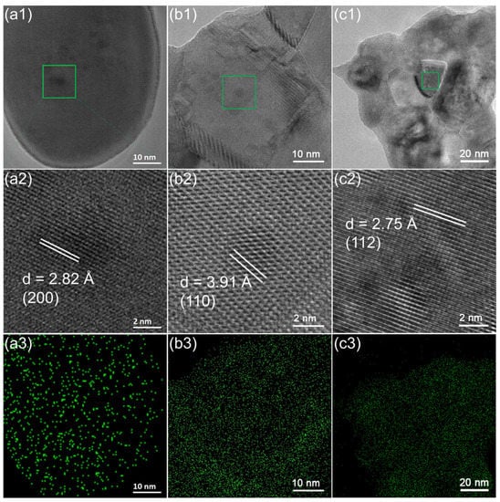 TEM and EDS mapping images of the used LaNixCr1−xO3 samples with x = 0.1 (a1–a3), 0.3 (b1–b3), and 0.5 (c1–c3). The first row shows TEM images, and the second row shows the corresponding magnified images of green squares in the first row. The third row shows EDS mapping images of Ni elements in the first row. The d-spacing values and their corresponding lattice planes of the perovskite oxides are labeled in the magnified TEM images.