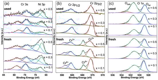 XPS spectra of the LaNixCr1−xO3 sample with x = 0.1, 0.3, and 0.5. (a) Cr 3s and Ni 3p spectra. (b) Cr 2p spectra. (c) O 1s spectra. The top half of Figure 4 shows the used samples, and the bottom half shows the fresh samples.