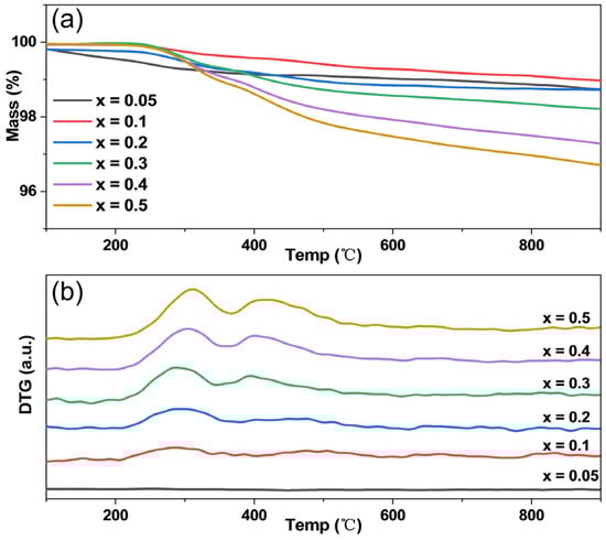 Figure 5 shows the TG and DTG profiles of fresh LaNixCr1−xO3 samples obtained by H2-TPR measurements. The TG profiles show that the samples are reduced in two steps. The first step is between 200 and 360 °C, and the second step is between 370 and 570 °C. Correspondingly, two well-resolved peaks are observed in each of the DTG profiles. Based on the above XRD analysis and literature survey [,] we can assign the low-temperature reduction step to the reduction of Ni3+ to Ni2+ in the LaNixCr1−xO3 perovskite and the high-temperature step to the reduction of NiO to Ni. Thus, we see that both the Ni content in the perovskite and the amount of NiO increase with x in the LaNixCr1−xO3 samples, and the Ni content in the perovskite is higher than that in NiO. It is also noted that no clear reduction step corresponding to the reduction of Ni2+ to Ni0 in the LaNixCr1−xO3 perovskite can be resolved up to 900 °C in the TPR profiles, indicating that Ni2+ is rather stable in the perovskite and difficult to reduce to Ni0. Stojanović et al. [] reported that LaNixCr1−xO3 compounds with x < 0.5 did not reduce to nickel metal in an H2 atmosphere at <900 °C. Nevertheless, the slowly decreasing trend in the TG profiles in the high-temperature section suggests that at least some of the Ni2+ cations in the perovskite were gradually reduced to Ni0 at high temperatures.