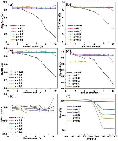 Figure 6a,b shows that for the x = 0.1–0.3 samples, the CH4 and CO2 conversions are stable within the 10 h on stream test. When the Ni loading is very low (x = 0.05), the CH4 and CO2 conversions show a decreasing trend. Nevertheless, the very high initial activity of the x = 0.05 samples indicates that the dispersion of Ni atoms on the catalyst surface is very high. The fast drop in the activity of the x = 0.05 sample should be because the Ni-support interaction is not strong enough to prevent the migration and aggregation of the highly dispersed Ni atoms []. Similar quick deactivation behavior in very low Ni loading catalyst was also observed in Ni/CeO2 []. On the other hand, when the Ni loading is too high (x = 0.4 and 0.5), the DRM reaction fails to proceed long because of the blockage of the fixed bed reactor by carbon deposition. The CH4 conversions over the x = 0.4 and 0.5 samples increase sharply at the end of the test, indicating that the CH4 decomposition side reaction dominates the carbon deposition side reactions. The H2/CO ratio, H2 selectivity, and carbon balance are also shown in Figure 6c–e, which will be discussed later. The mass loss in the TPO profiles (Figure 6f) between approximate 500–700 °C reflects the amount of deposited carbon, which increases remarkably with Ni content.