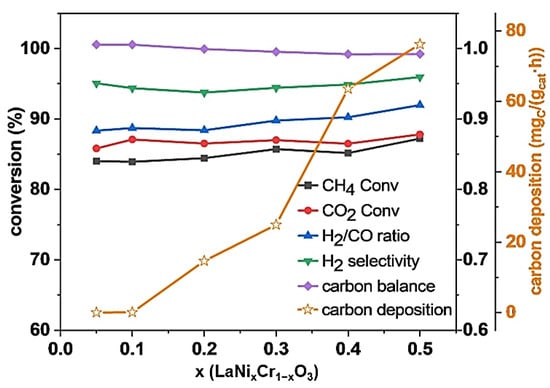 Changes in CH4 conversion, CO2 conversion, H2/CO ratio, H2 selectivity, carbon balance and carbon deposition with x in LaNixCr1−xO3 at 750 °C. Condition: 12 L g−1 h−1, CH4:CO2 = 1. The data reported in Figure 7 are those collected at a reaction time of 2 h.