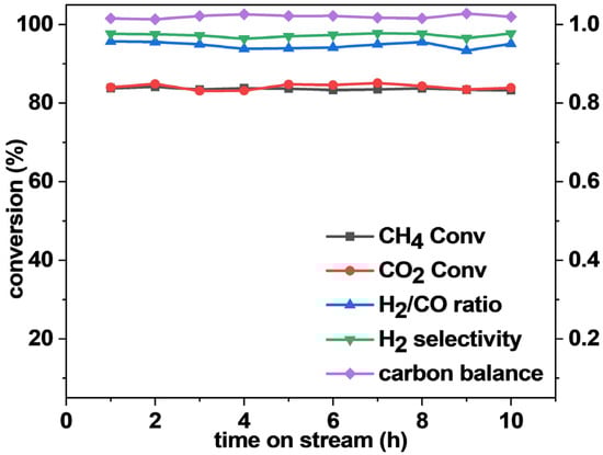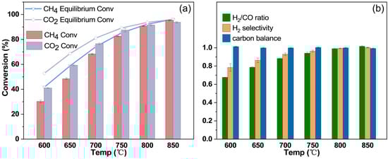 Dry reforming of methane (DRM) is an important reaction that converts two greenhouse gases, CH4 and CO2, to valuable syngas, H2 and CO, with an H2/CO ratio close to 1, which is suitable for synthesizing long-chain hydrocarbon chemicals through the Fischer-Tropsch reaction [,]. DRM is also attractive in saving the cost of CO2 separation when CO2-rich CH4 gas, such as biogas, is used as a feedstock to produce syngas [,]. Catalysts play a crucial role in a DRM reaction because both CH4 and CO2 are very stable molecules, and the reaction kinetics at economic reaction temperatures will be very sluggish without a high-performance catalyst. A DRM reaction is endothermic. To achieve acceptable CH4 and CO2 conversions limited by thermodynamics, the reaction needs to be carried out at temperatures typically higher than 600 °C []. Side reactions, such as the CH4 decomposition reaction (CH4 = 2H2 + C) and the Boudouard reaction (2CO = CO2 + C), may result in coking that will deactivate the catalysts or even block the reactor [,]. The reverse water–gas shift side reaction (RWGS, CO2 + H2 = CO + H2O) always occurs simultaneously with DRM, which reduces the H2/CO ratio to lower than 1. Thus, an ideal catalyst for DRM should be highly active, coking resistant, and thermostable [].