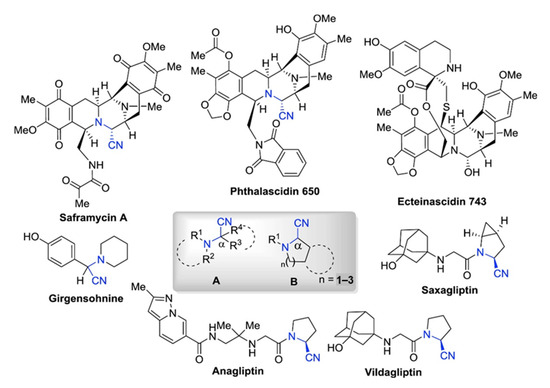 α-Aminonitriles are widely used in various fields of pharmacology (Figure 1). Firstly, they are the starting materials for the synthesis of amides, 1,2-diamines, α-amino acids, α-amino alcohols, and α-amino carbonyls, as well as imidazoles and thiadiazoles, all of which are basic and important units in the field of synthetic chemistry [1,2,3,4,5,6]. Secondly, α-aminonitriles containing compounds play significant roles in various therapeutic activities, such as anticancer, antiviral, and antibacterial [1,2]. For the treatment of diabetes, some aminonitriles have been recognized as reversible inhibitors of dipeptidyl peptidase (DPP4) [7]. Nitriles of N-aryl-tetrahydroisoquinolines (THIQs) have been employed as pesticides against animal mites, such as Psoroptes cuniculi [8]. Other aminonitriles containing compounds, such as phthalascidin and saframycin A, show effective anti-tumor activity [1,2]. Moreover, (S)-clopidogrel and antiplatelet drug, can be prepared from 2-(2-Chlorophenyl)-2-(6,7-dihydrothieno [3,2-c]pyridine-5(4H)-yl)acetonitrile [9]. Therefore, the synthesis of α-aminonitriles has received much attention in the pharmaceutical field.