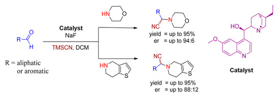 In 2012, Arghya Sadhukhan et al. approached an asymmetric Strecker reaction with aldehydes and secondary amines for the construction of α-aminonitriles using hydroquinine as a chiral catalyst in the presence of sodium fluoride. This catalytic system afforded several essential α-aminonitriles in excellent yields with high enantioselectivities, given in Scheme 3 [24].