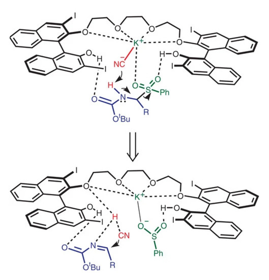In 2012, Hailong Yan and co-workers developed a 3,3′-diiodine-substituted BINOL (1,1′-bi-2,2′-naphthol)-based organocatalytic protocol for asymmetric Strecker reaction that uses a readily available chiral version of oligoethylene glycol as a catalyst and KCN to make a chiral cyanide anion as demonstrated in Figure 2. The metal (K+) present at the active organocatalyst site is provided by the KCN reagent. This method provided excellent yields and efficiency for the synthesis of asymmetric α-aminonitriles Strecker products from α-amido sulphones. Using this efficient catalytic protocol, enantiomerically pure non-natural a-amino acids were produced on a gram scale from α-amido sulphones [25].