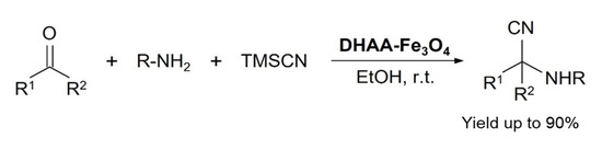 In 2013, Dariush Saberi and fellows developed a dehydroascorbic acid capped magnetite (DHAA-Fe3O4) catalyst for Strecker reaction to synthesize α-aminonitriles and α-aminophosphonates. Various derivatives of the relevant products were synthesized in good yields at ambient reaction conditions, see Scheme 7. The catalyst was reused six times in a model reaction of benzaldehyde, aniline, and TMSCN without any significant loss in the catalyst reactivity [39].