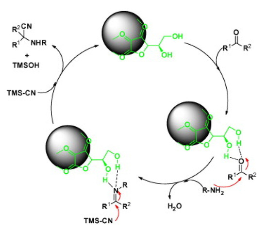 In the proposed mechanism, the carbonyl group is activated by hydrogen-bonding of amide groups of the catalysts, making it susceptible to the nucleophilic attack of the amine to produce imine. In turn, imine nitrogen is further activated by the amide group of the catalyst via hydrogen bonding. Then, the imine carbon is attacked by the cyanide group to afford the corresponding adduct of α-aminonitrile [44].
