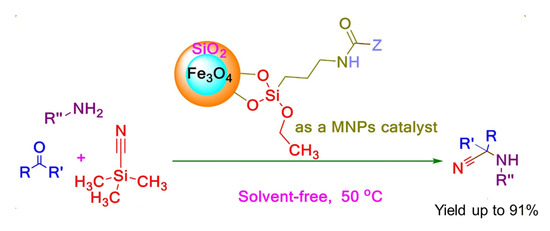 In 2017, Saeed Baghery and co-workers reported four magnetic nanoparticle (MNP) catalysts with urea or urethane moieties for Strecker synthesis of α-aminonitriles, given in Scheme 10. The magnetic nanoparticles coated with silica were simply activated by the addition of 3-(triethoxysilyl)propylisocyanate (TESPIC), amine, or amino alcohol. The TESPIC having dual labile functional groups was employed as an applicable precursor for the construction of urethane-based catalysts. These recyclable functionalized catalysts were employed in the synthesis of α-aminonitriles giving high to excellent yields at 50 °C under solvent-free conditions. To check the recyclability of the catalyst, the reaction was monitored by TLC thoroughly. When the reaction was completed the catalyst was separated by an external magnet, after washing with ethanol, reused seven times without any change in its efficiency [44].