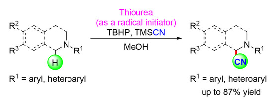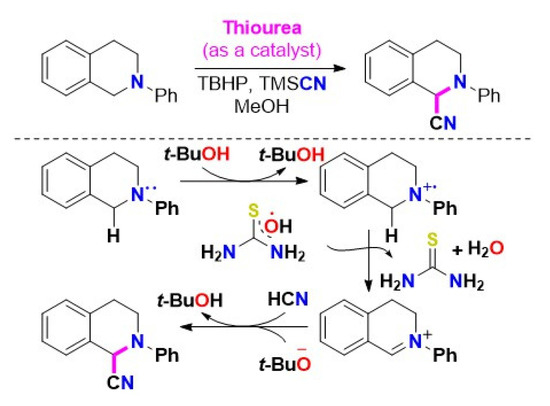 Our 2019 investigation reported the use of thiourea as a mild and effective organocatalyst to oxidatively a-cyanate N-aryltetrahydroisoquinolines (THIQ) with cyanide source TMSCN, yielding a-aminonitrile analogs in good to excellent yields (Scheme 12). The results of this study show that thiourea acts as a radical initiator by abstracting hydroxyl radicals (*OH) directly from tert-butyl hydroperoxide (TBHP) rather than through noncovalent hydrogen bondings (H-bonds) [47].
