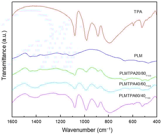 The bands assigned to the stretching vibrations W-Oc-W, W-Ob-W, and P-Oa in the spectrum of PLMTPA60/40T100, PLMTPA40/60T100, and PLMTPA20/80T100 samples overlap the characteristic bands of PLM (Figure 2). Their intensity increases with the increment of the sample TPA content, and it confirms the presence of [PW12O40]3− anion as the main species. The FT-IR spectra of samples treated at 200 and 300 °C display similar characteristics. However, in the samples calcined at a higher temperature, the relative intensity of the TPA main bands slightly increases due to PLM chemical transformation and partial decomposition (Figure S2).