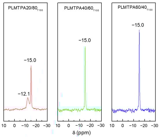 31P MAS-NMR spectra of PLMTPA20/80T100, PLMTPA40/60T100 and PLMTPA60/40T100 samples.