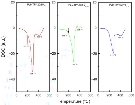 The DSC diagrams of the PLMTPA20/80T100 and PLMTPA40/60T100 samples (Figure 4) present the three endothermic peaks mentioned above at slightly lower temperatures. In the case of the PLMTPA40/60T100 material, the peak assigned to the glass transition is barely visible. For the PLMTPA60/40T100 samples, the glass transition peak is not present, and the other two endothermic peaks appear at lower temperatures (279 and 385 °C). These results show that PLMTPAXX/YYT100 materials do not undergo any remarkable chemical changes up to 200 °C.