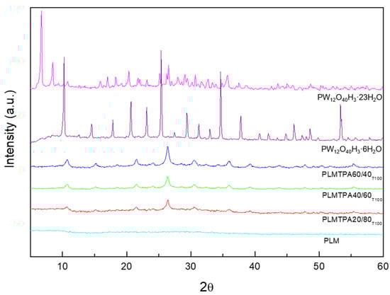 XRD patterns of H3PW12O40·23H2O (JCPDS No 50-0655), H3PW12O40·6H2O (JCPDS No. 50-0304), PLMTPA60/40T100, PLMTPA40/60T100, PLMTPA20/80T100, and PLM samples.