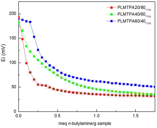 The acidity properties of the PLMTPAXX/YY materials, estimated from the potentiometric titration with n-butylamine curves (Figure 6), are listed in Table 1. According to the potentiometric results, all the materials exhibit Ei values higher than 100 mV [], assigned to the presence of very strong acid sites (see the classification scale in supplementary materials).