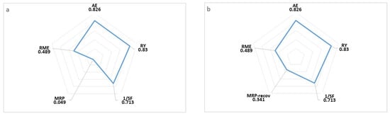 Since Barry Trost introduced the atom economy concept in 1991 [] and Paul Anastas and John Warner defined the 12 principles of green chemistry [], several groups, including ours, have started to consider the best ways to adopt this working approach. One way of verifying how close the synthesis method used is to an ideal process, from the green chemistry point of view, is using some of the green parameters defined by John Andraos and coworkers in several publications [,,] and representing them in a polygon graphic. In our case, we decided to represent five of these parameters, atom economy (AE), reaction yield (RY), stoichiometry factor (SF), material recovery parameter (MRP), and reaction mass efficiency (RME), in a radial pentagon (Figure 7a,b). For comparative purposes, we studied the green parameters on the same reaction with (Figure 7b) and without (Figure 7a) solvent and catalyst recovery. We noted that the change was in the MRP parameter, which increased approximately ten times when we recovered the solvent and catalyst.