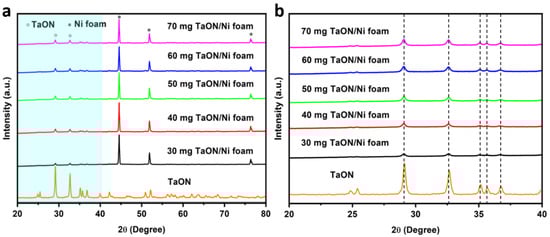 In Figure 1a, the diffraction peaks at 2θ values of 44.5, 51.8, and 76.4° belong to the (111), (200), and (220) crystal planes of the cubic nickel (PDF#04-0850), respectively. The diffraction peaks of TaON are clearly observed in TaON/Ni foam. The diffraction peaks locating to 29.1 and 32.7° are ascribed to the (−111) and (111) crystal planes of the monoclinic TaON (PDF#70-1193), respectively [20]. It can be clearly seen from Figure 1b that the diffraction peaks at 35.1, 35.6, and 36.7° are also assigned to the (002), (020), and (200) crystal planes of the monoclinic TaON. Furthermore, with the increase in TaON content in TaON/Ni foam, its characteristic peak intensity increases gradually. The XRD results suggest that the TaON is successfully deposited on Ni foam to obtain the TaON/Ni foam.