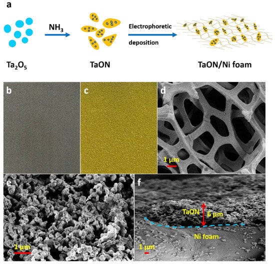 (a) Schematic diagram of the preparation of TaON/Ni foam; images of (b) Ni foam and (c–f) 60 mg TaON/Ni foam.