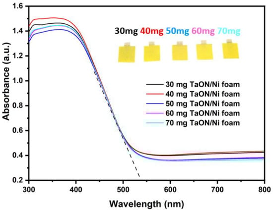 As depicted in Figure 3, the light absorption performance of TaON/Ni foam is not distinctly affected by the content of TaON. All TaON/Ni foam can absorb photons with maximum wavelength of about 540 nm. The band-gap energy (Eg) of the TaON/Ni foam is calculated to be 2.3 eV by the Equation (2), which is in line with the literature [23,24].