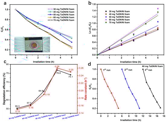 (a) Concentration curve of BF over TaON/Ni foam with time; (b) pseudo-first-order degradation kinetic curves; (c) photocatalytic degradation efficiency and rate constant; (d) photocatalytic stability of 60 mg TaON/Ni foam.