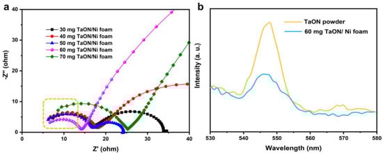 (a) Electrochemical impedance spectroscopy of TaON/Ni foam; (b) PL spectra of TaON powder and 60 mg TaON/Ni foam.