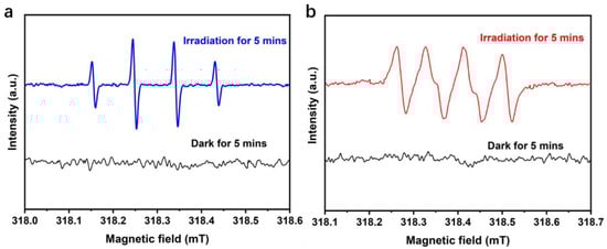 It is well known that the primarily active species in the photocatalytic reaction are h+, ·OH, ·O2−, and so on [28]. ESR technology is used to detect active free radicals in the process of BF degradation. In the process of ·O2− detection, in order to avoid the interference of ·OH signal, methanol is used instead of water as solvent. Under light irradiation for 5 min, four peaks with the signal intensity of 1:2:2:1 (Figure 6a) in water solution and 1:1:1:1 (Figure 6b) in methanol solution are observed, which originate from the signals of ·OH and ·O2−, respectively [29]. No peaks are found for 5 min in the dark. The ESR results suggest that the radicals for BF degradation are ·OH and ·O2−. The potentials of the conduction-band and valence-band edges of TaON are around −0.34 and 2.16 V, respectively [30]. Due to the potential of ·O2−/O2 (−0.33 eV) [31], the free radical of ·O2− can be generated by the Equation (3).