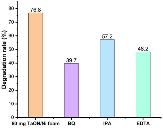 In order to ascertain the crucially active species for BF degradation, benzoquinone (BQ), isopropanol (IPA), and EDTA are added into BF solution as capture agents for superoxide radical (·O2−), hydroxyl radical (·OH), and hole (h+), respectively [32]. The concentration of scavengers is 0.1 mmol L−1. After the BQ, IPA and EDTA are added into BF solution, the degradation rates of BF over 60 mg TaON/Ni foam decrease to 39.7%, 57.2%, and 48.2%, respectively (Figure 7). The results imply that the ·O2−, h+, and ·OH participate in the degradation of BF. Among them, the free radical of ·O2− plays the most significant role.