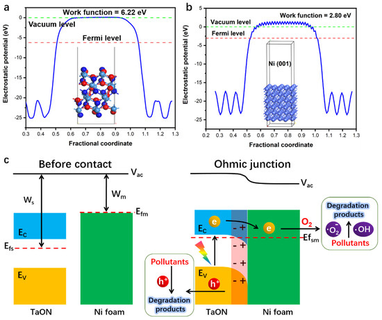 The work functions of TaON and Ni are calculated to study the mechanism of carrier migration separation for BF degradation. As illustrated in Figure 8a,b, the work functions of TaON (001) and Ni (001) are 6.22 and 2.8 eV, respectively. When TaON and Ni foam are in contact in the dark, the electrons of Ni foam will flow to TaON causing the interfacial energy band of TaON to bend downward. With the electron migration, the Fermi level of TaON shifts upward and that of Ni foam comes downward until their Fermi levels are same. Ultimately, an electric field is built from the surface to the bulk phase of TaON, thereby forming the ohmic junction between TaON and Ni. Under light irradiation, the photogenerated electrons of TaON will be driven to Ni foam by the interfacial electric field and then react with O2 to produce ·O2− and ·OH, which are used to decompose BF. The hole from the valence band of TaON will directly oxidize BF resulting in its degradation (Figure 8c).