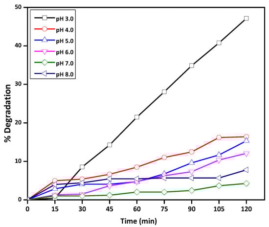 The pH of the reaction solution for the oxidative degradation of organic pollutants is a crucial parameter for Fenton’s reaction, and, accordingly, the number of the •OH radical generation varies. Figure 2 shows the effect of the initial solution pH on the sonochemical degradation of ANB in an aqueous solution. It was observed that the degradation efficiency of ANB declined from 47% to 4% and from pH 3.0 to 8.0. At an alkaline pH, the oxidation efficiency of FFGN decreases due to the formation of Fe(OH)3, which reacts with H2O2 to form ferrous iron. At pH < 4.0, the formation of Fe(OOH)2+ will be more due to the high concentration of hydrogen ions, and this increases the formation of •OH radicals in the Fenton oxidation process []. It was observed that higher degradation was obtained at pH 3.0, in acidic conditions, which favor the dissolution of Fe, and large quantities of Fe2+ can be generated under acidic conditions. Fe2+, along with H2O, generates higher reactive •OH radicals, playing an important role in disintegrating the sturdy ANB molecules []. The pH was considered to be optimum at pH 2.0–4.0, and the degradation of ANB was possible at pH 3.0 in an acidic medium, which prevents the catalyst iron from precipitating. Moreover, at pH < 3.0, due to the formation of a hexaaquairon ion, which lowers the available iron to react with H2O2, resulting in the stable formation of H2O2. At low pH, H+ acts as a scavenger, resulting in the formation of oxonium ions [H3O2]+, which reduces the reactivity of iron and retards the reaction. At pH > 4.0, the degradation declines, which is attributed to the ferrous and ferric hydroxide complex formation, which possesses Fe2+ in terms of OH radical production. The formation of ferric hydroxide, thus, removes the iron from the reaction and reduces the efficiency of the process. At an alkaline pH, the oxidation efficiency of FFGN decreases due to the formation of Fe(OH)3, which reacts with H2O2 to form ferrous iron, and ferric hydroxide will precipitate, and both will result in a decrease in the efficiency of the Fenton process [,]. At pH > 4.0, the degradation declined, which was attributed to the ferrous and ferric hydroxide complex formation, which possesses Fe2+ in terms of OH radical production [].