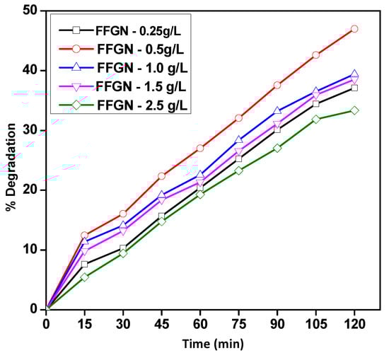 The catalytic oxidation of ANB was performed by varying the FFGN dose from 0.25 to 2.5 g/L. Since better removal was obtained at pH = 3.0, this study was performed with pH = 3 ± 0.2, ANB = 50 ppm, and T = 25 ± 1 °C. The ANB degradation increased from 37% to 47% in the catalyst concentration variation study. When the FFGN content was 0.5 g/L, the ANB oxidation rate was at the highest level (i.e., 47%). As mentioned earlier, the Fe2+ dosage has a high impact on the disintegration of ANB through •OH radicals formed out of it. At an acidic pH, the •OH radical can be generated from a heterogeneous reaction between the catalyst surface FeII (FeIII) and H2O2 (Equation (1)) and from the outer-surface reaction between Fe2+ and H2O2, which cleaves the homolytic O-O bond, which was induced by the homogenous Fenton reaction by leached iron []. In addition, the guaran present in the surface of the nanocomposite also induces the Fenton oxidation process by producing the •OH radical.