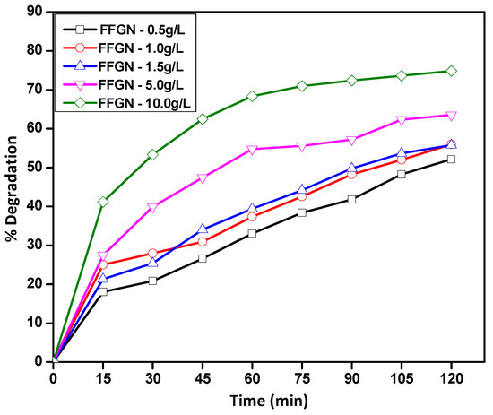 Initially, the sonophotochemical degradation of ANB that was performed at solution pH 8.0 resulted in only a 13% removal, and when performed at pH 3.0, this had increased to 33%. In the presence of the FFGN catalyst at pH 3.0, the removal resulted in a 47% increase, which was due to the Fe2+ ions and OH groups present in the nanocomposite, which led to a lower pH condition [].