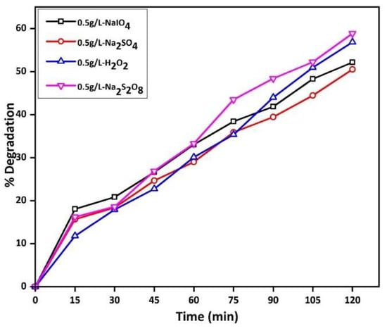 The effect of different oxidants on the degradation of ANB was performed at the experimental conditions of pH = 3.0 ± 0.2, ANB = 50 ppm, FFGN = 0.5 g/L, T = 25 ± 1 °C, and the results are shown in Figure 7.