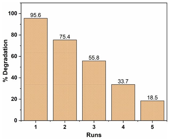 Recycling Study of FFGN for the catalytic oxidation of ANB (pH = 3.0 ± 0.2, ANB = 50 ppm, FFGN = 0.5 g/L, Na2S2O8 = 0.06 mol/L, Amplitude = 40%, Probe = 25 mm, T = 25 ± 1 °C).