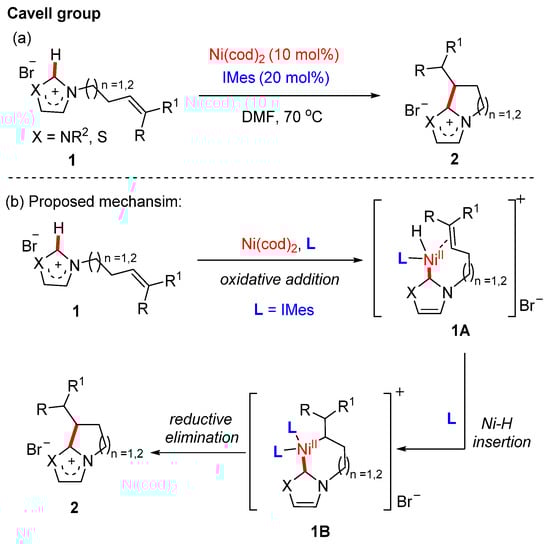 (a) Ni(cod)2-catalyzed intramolecular C(sp2)–H alkylation of alkenyl-substituted imidazolium salts; (b) Proposed mechanism.