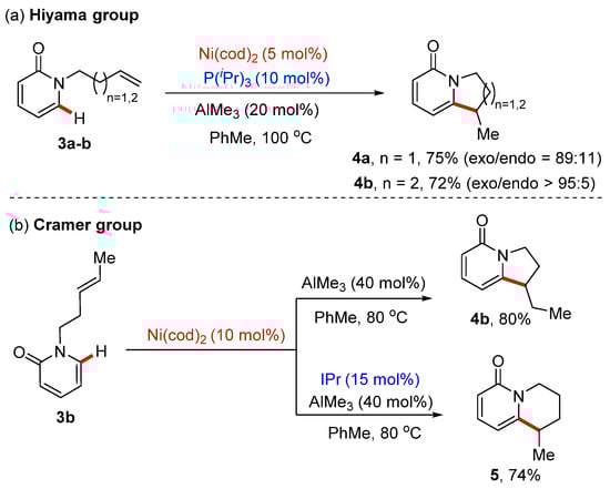 Pyridone skeletons are widely present in a variety of important biologically active heterocyclic compounds [,,]. Therefore, the development of novel, effective, and rapid methods for obtaining these heterocyclic compounds is of interest to synthetic and medicinal chemists. In 2009, the Nakao and Hiyama group developed a Ni(cod)2/AlMe3 co-catalyzed intramolecular C–H alkylation of alkenyl-substituted pyridones 3 in the presence of P(i-Pr)3 as a ligand []. In this reaction, AlMe3 acts as an important Lewis acid to assist the reaction by activating the carbonyl group of the substrate. The intramolecular insertion of the unsaturated bond was achieved, leading to the synthesis of the five-membered fused-ring pyridone derivatives 4a-b in good yields (Scheme 2a). Notably, this intramolecular alkylation process mainly gave rise to exo-cyclization products, although theoretically the reaction could occur at both ends of the double bond, leading to the formation of both exo and endo products. Thereafter, control over the cyclization mode of this reaction has become the focus of the subsequent related research.