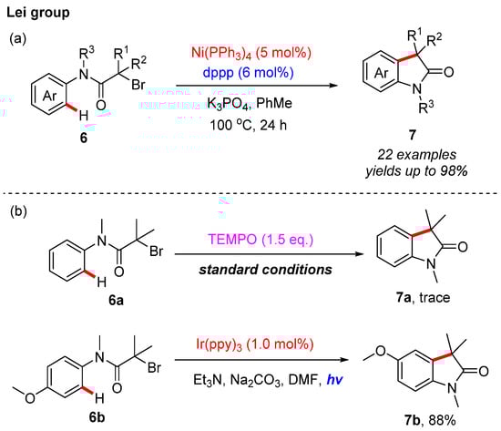 - Liu, C.; Liu, D.; Zhang, W.; Zhou, L.L.; Lei, A. Nickel-catalyzed aromatic C–H alkylation with secondary or tertiary alkyl–bromine bonds for the construction of indolones. Org. Lett. 2013, 15, 6166–6169. [Google Scholar] [CrossRef]