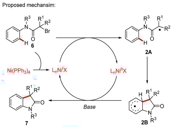 In addition, Lei and co-workers reported Ni(PPh3)4-catalyzed intramolecular C(sp2)–H alkylation exploiting the alkyl–Br bonds []. Substrates with different functional groups were well tolerated in this reaction, and the desired indolones were obtained in moderate to good yields (Scheme 3a). Both visible photocatalysis and radical trapping experiments indicated that a radical process might be involved in this process (Scheme 3b). Furthermore, a mechanism involving a Ni(I)/Ni(II) catalytic cycle was proposed (Scheme 4). It is believed that the Ni(I) species is formed through a SET process between Ni(PPh3)4 and the alkyl bromide substrate 6. Afterwards, a second SET between the Ni(I)species and substrate 6 generates the radical species 2A and the Ni(II) species. Next, the intramolecular radical addition provides the intermediate 2B. Finally, the further oxidation of this intermediate with the Ni(II) species yields the desired product 7 and the Ni(I) species. Meanwhile, the Kalyani group also demonstrated an effective method for the synthesis of carbazoles 9 through Ni(cod)2-catalyzed intramolecular C–H arylation employing aryl pivalates 8 as starting materials []. In the substrate scope study, two carbazoles were isolated in moderate yields (Scheme 5). Mechanistic studies indicate that a CMD-type C–H activation step might be involved in this process.