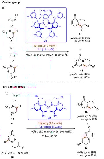 In recent years, chiral N-heterocycle synthesis has become an unmistakably critical target [,]. Encouraged by previous reports, the Cramer group reported a Ni(cod)2-catalyzed chiral ligand-enabled enantioselective intramolecular C–H alkylation reaction []. Various kinds of chiral bicyclic heterocycle products were isolated in good yields and excellent enantioselectivities (Scheme 6a). It is worth noting that a bulky chiral N-heterocyclic carbene ligand L1 was demonstrated as the most effective chiral ligand for this asymmetric process. MAD was proved as the optimal Lewis acid. Under mild reaction conditions, alkenyl-substituted 2-pyridone substrates 10 were converted to the corresponding six-membered fused-ring 2-pyridone derivatives 11 in good yields (up to 91% isolated yields) and excellent enantioselectivities (up to 98% ee). In addition, 4-pyridone and uracil compounds could also be used as reaction substrates to obtain chiral bicyclic heterocycles with good yields (up to 93% isolated yields) and excellent enantioselectivities (up to 98% ee). The experimental results show that the substituents of the substrates have little effect on the reaction, and the chirality of the target product is exclusively controlled by the chiral ligand.